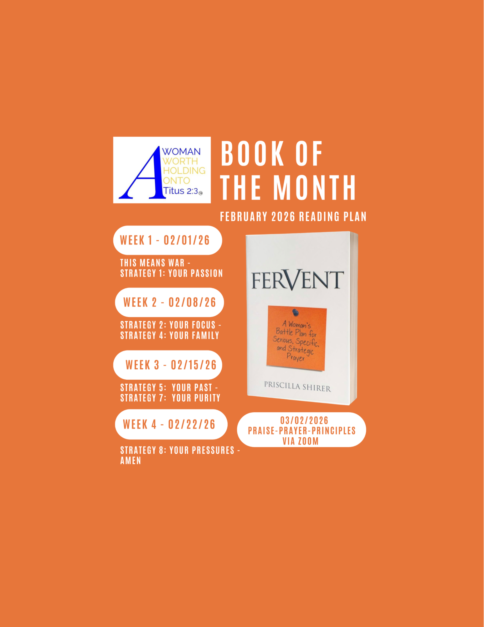 Join us as we add to our weekly Intimate Morning of Prayer (IMOP) our AWWHO Global Book Club. During 2026 we will increase our focus on prayer as we journey through 12 different books on Prayer. What will participation in the Book Club include? I’m glad you asked. It will include: